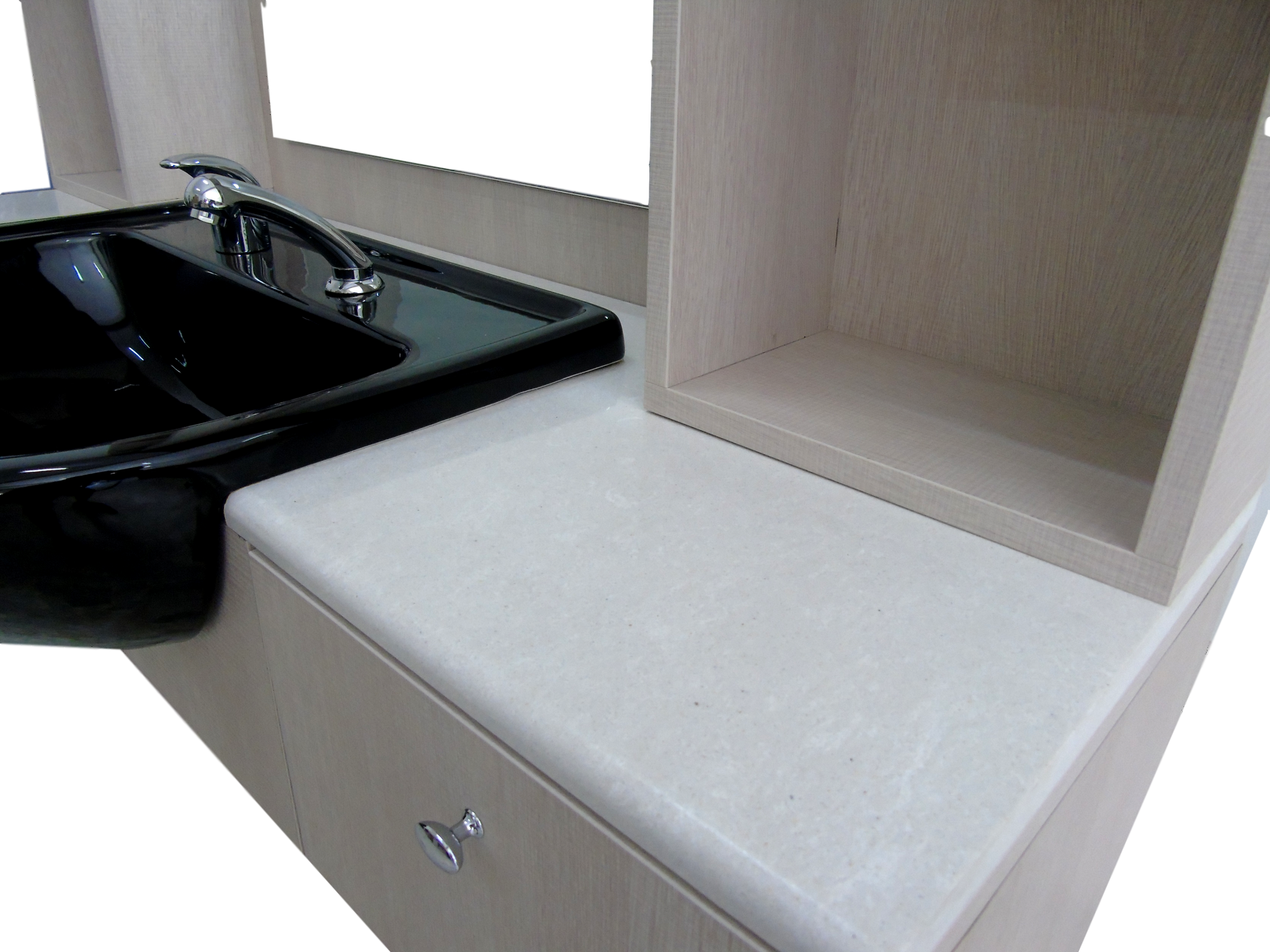 postazione singola misure di fabbrica L 360 x H 205 x P 40 disponibili con lavello ad incasso barber colore bianco o nero , lavello da appoggio " ciotola " o lavello ad incasso in acciaio , piano di lavoro in Okite